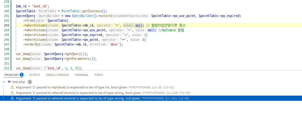 * where 부분 컬럼 타입이랑 안맞으면 경고 , 정적분석기로 오류표시