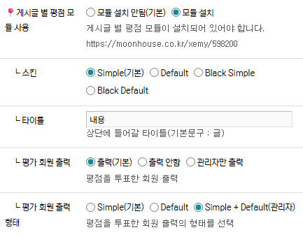 3. 게시판 스킨 설정에서 "게시글 별 평점 모듈 사용" 에서 "모듈 설치"를 선택하면 됩니다.