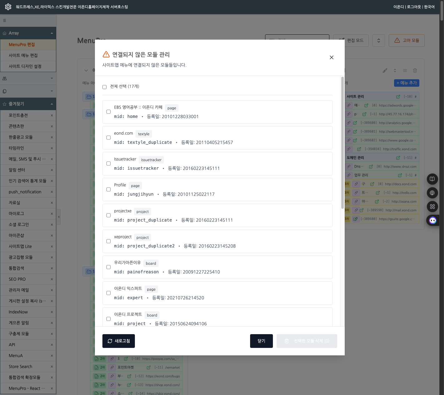 | 간단한 소개 | MenuPro 모듈은 기존 XE/라이믹스의 불편한 사이트맵 메뉴 관리 기능을 편리하게 수정할 수 있는 모듈입니다. |