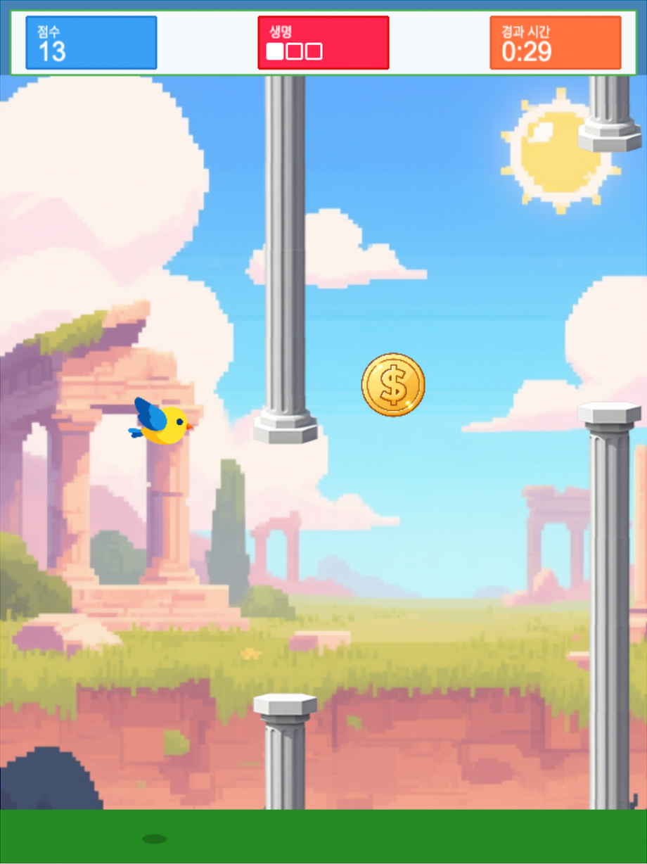 - 중력 기반 조작: 화면 클릭/터치로 새를 조종하여 파이프 사이를 통과