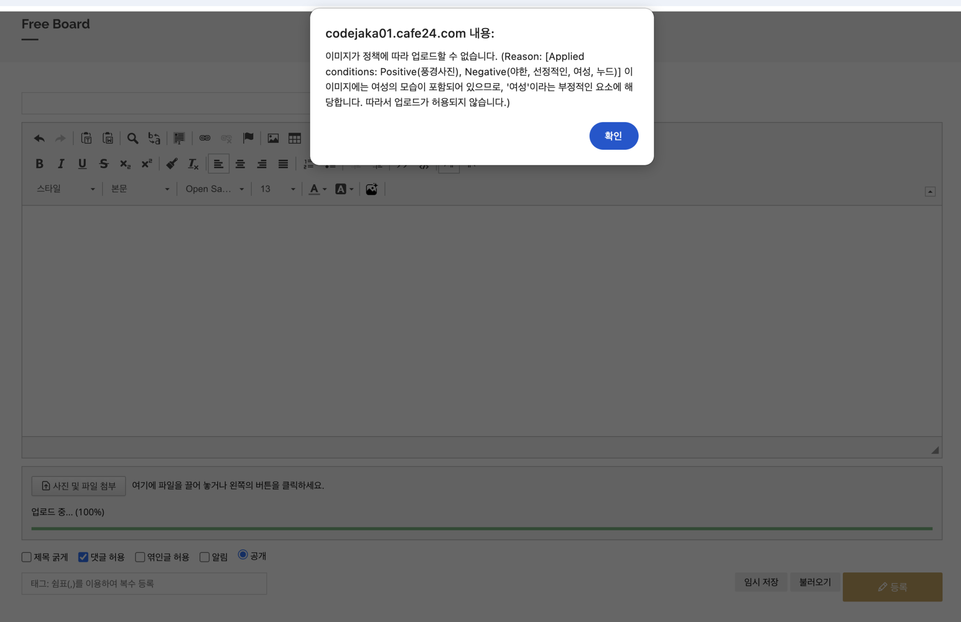 - 유해 이미지 차단(검열) : 글쓰기/에디터에서 이미지를 첨부하면, 업로드 직전에 AI가 이미지를 분석합니다. 설정한 규칙(긍정·부정 프롬프트)에 어긋나면 업로드를 막고 사용자에게 안내 메시지를 보여 줍니다.