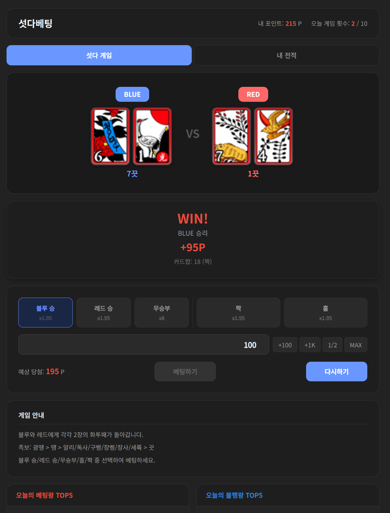 한국 전통 화투 기반의 섯다 카드게임을 웹에서 즐길 수 있습니다.