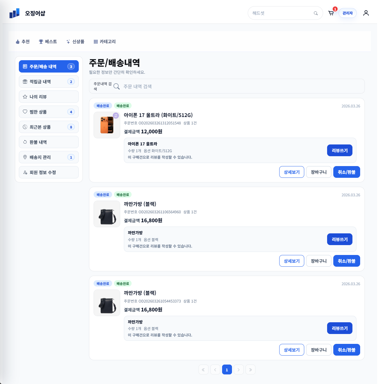- 장바구니 및 장바구니 관리
