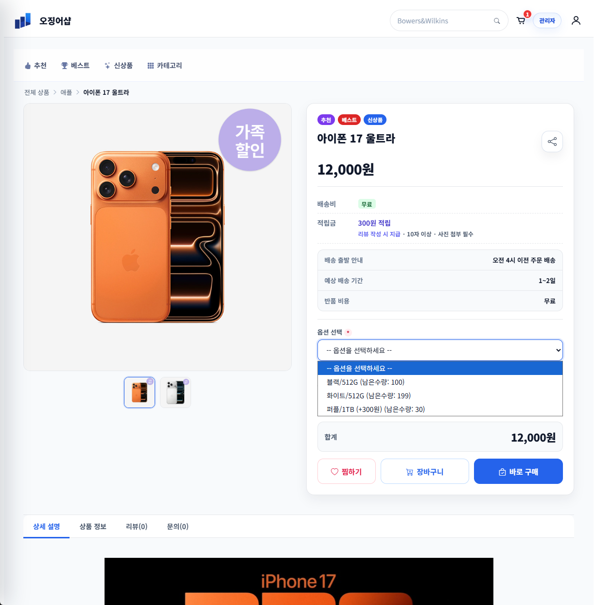 - 상품별 다중 옵션