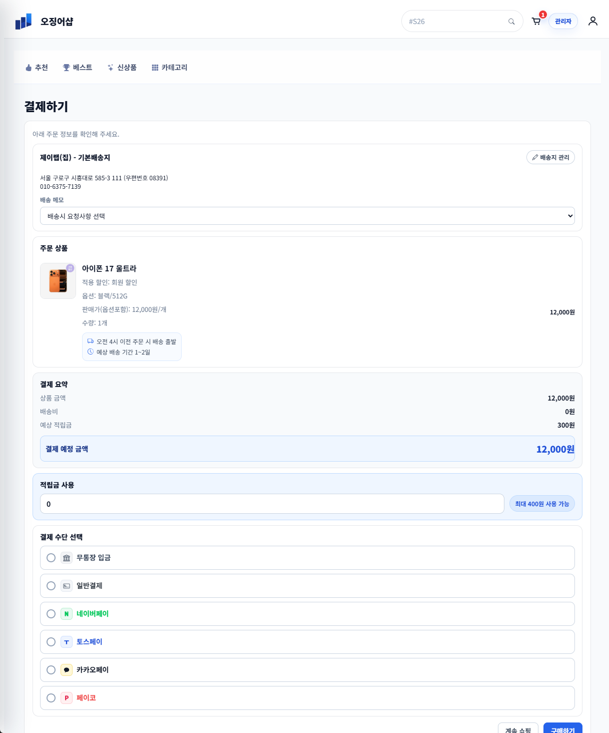 - 네이버, 카카오 페이등 다양한 간편 결제 지원