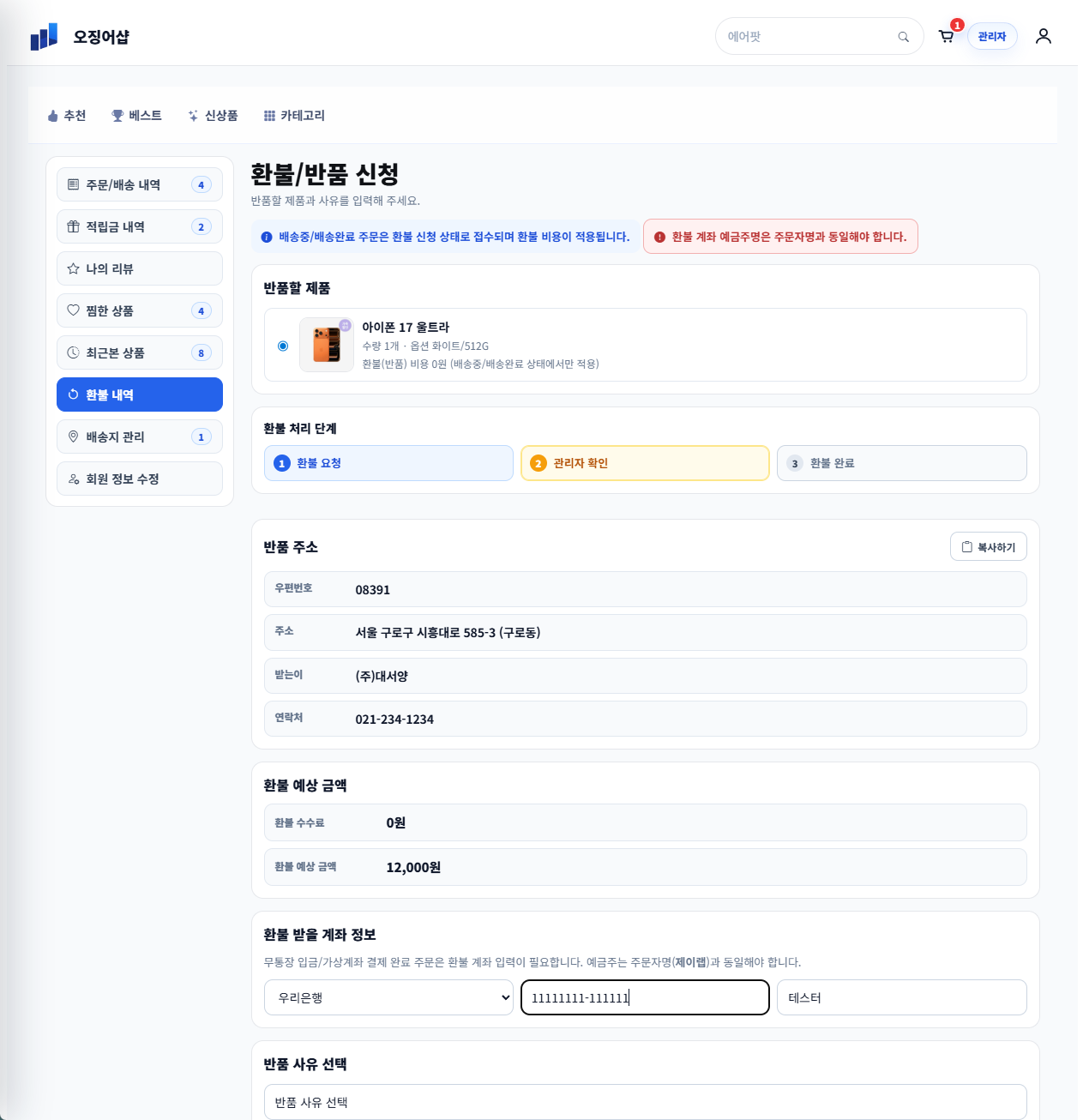 - 편리한 반품 / 환불 배송 주소지 관리