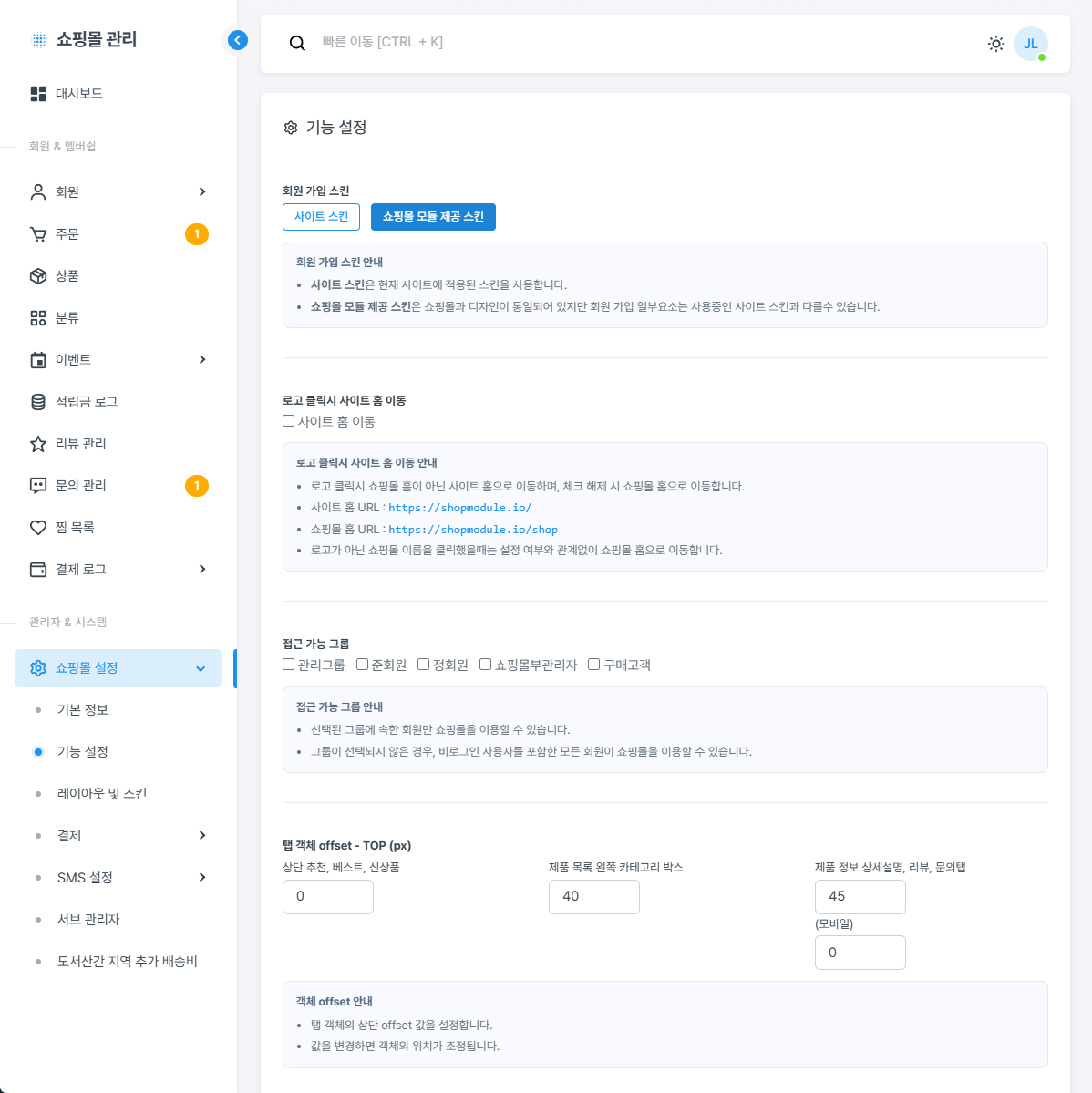데모 쇼핑몰 : https://shopmodule.io/shop