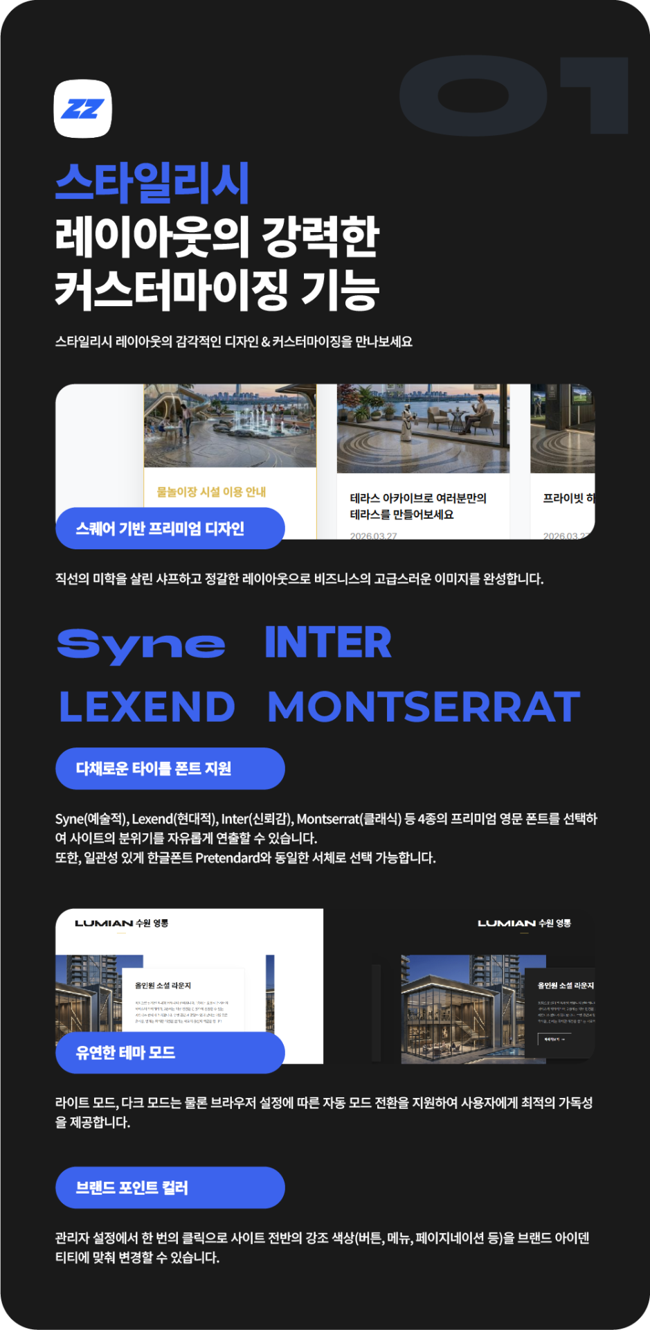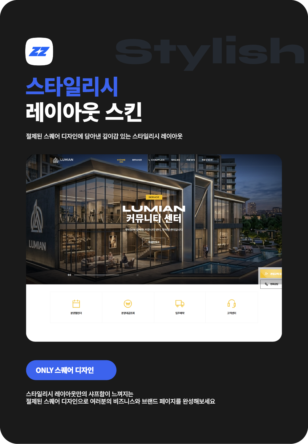 | 간단한 소개 | 절제된 스퀘어 디자인에 담아낸 깊이감 있는 스타일리시 레이아웃 |