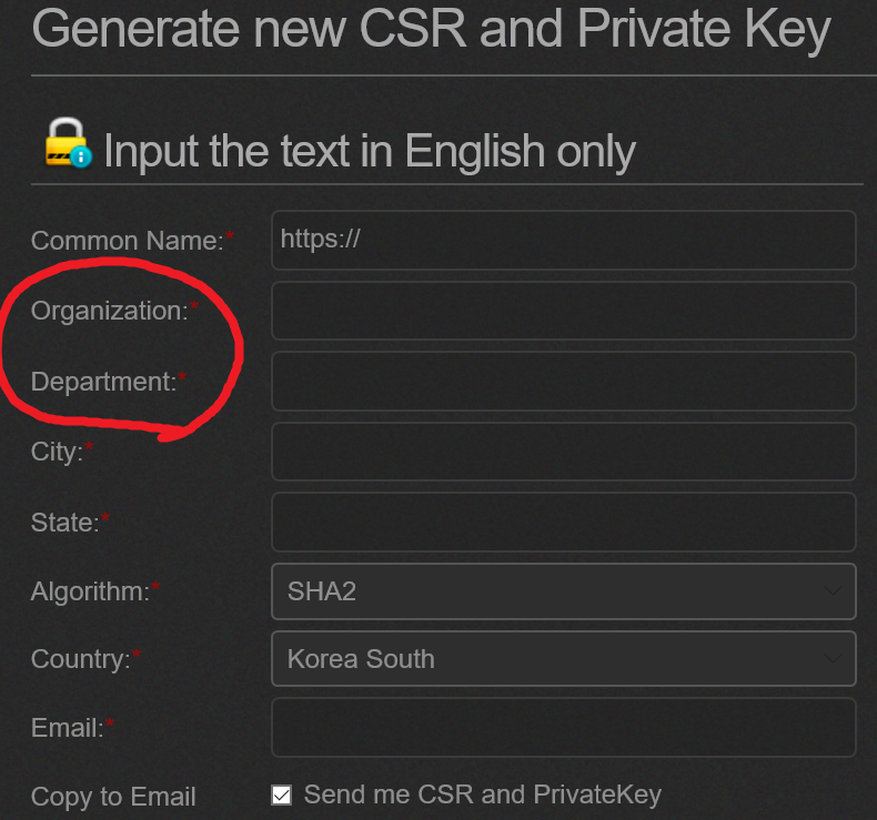 gogetssl의 online csr generator에서 "organization"이랑 "department"가 대체 뭔가요? 기븐 2015.11.30 10:39 307 0 10 영어 단어 뜻을 물어보는게 아니라... 저기에 대체 뭘 써야 하는건지 도저히 모르겠네요 구글링해도 안나오고;;;