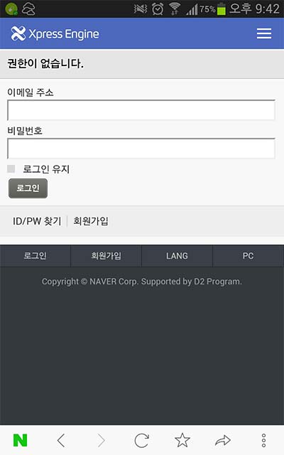 모바일 다른 모든 부분에서 로그인 링크를 누르면 설정한 스킨이 나타나는데 유독 모바일에서 게시판 권한이 없을때 자동으로 나타나는 로그인창이 회원설정 > 디자인 > 모바일 스킨에서 지정한 스킨이 아니라 아래 그림과 같은 다른 화면이 나타납니다.