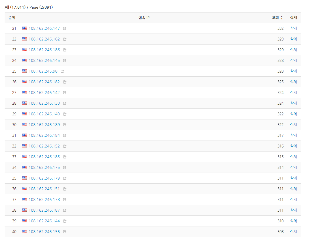 이게 리퍼러 수집 모듈을 통해 수집한 클라우드플레어 IP로 찍힌것들인데요