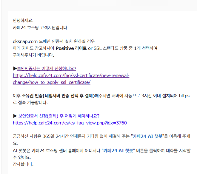 내년에는 인증서 갱신하기 한두 달 전에 미리 도메인을 카페24로 옮겨두세요.