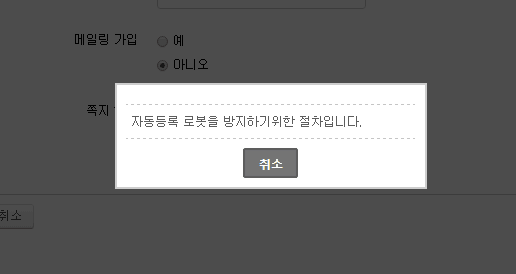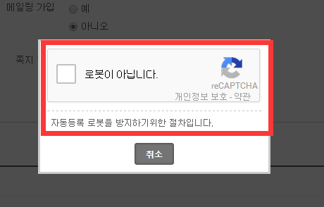 두개 캡쳐화면중 아래 화면처럼 나와야 정상인데 윗화면처럼 "로봇이 아닙니다" 화면은