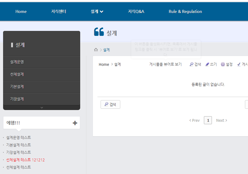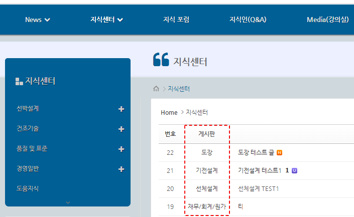 보시는것 처럼 지식센터 메뉴를 누르면 지식센터라는 게시판에 소속된 모든 서브게시판의 게시물이 목록으로 나옵니다.