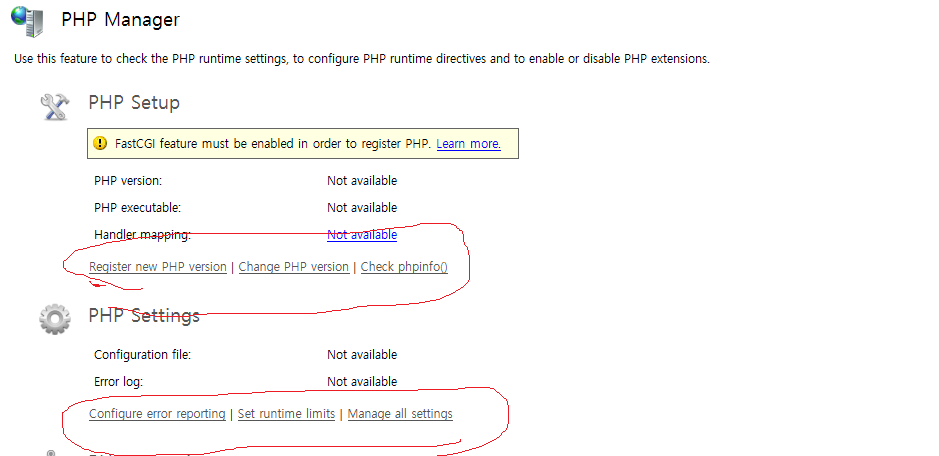 Fastcgi를 활성화해주세요. IIS 버전에 따라 방법이 다를 수 있으니 구글에 검색해 보시면 될겁니다. 마침 Learn more 부분에 링크도 걸려 있네요.