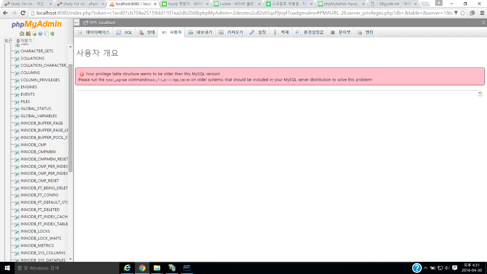 우여곡절끝에 phpMyAdmin 까지 왔는데 보시다시피 사용자 탭이 열리질 않습니다.
