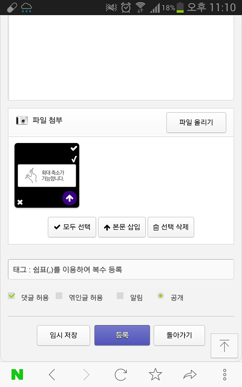 라이믹스가 적용된 xe타운 스케치북 게시판 pc버젼에서는 이미지 파일 본문 자동 첨부가 되고 모바일에서는 아래 이미지처럼 모두선택, 본문삽입 등의 추가 버튼이 있어 여러모로 편하더라구요.