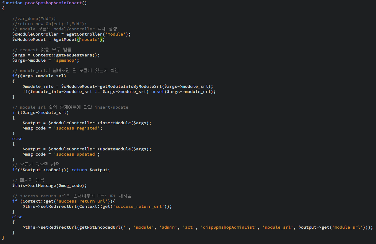 필터 쓰다가 룰셋공부겸... 만들어보고있는 모듈이있는데 관리자 측에서 모듈생성하려니 등록누르면 백지가 되어버리네요 ㅎㅎ.. dispSpmshopAdminInsert 함수에 디버그 //var_dump(); //return new Object(-1,); 찍어도 값이안뜨는걸보니..