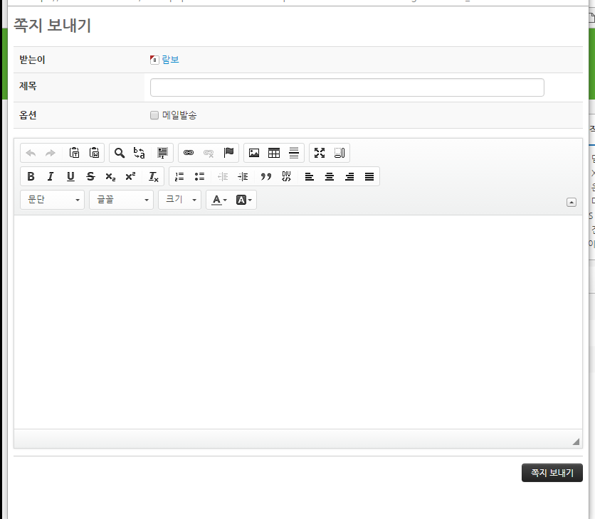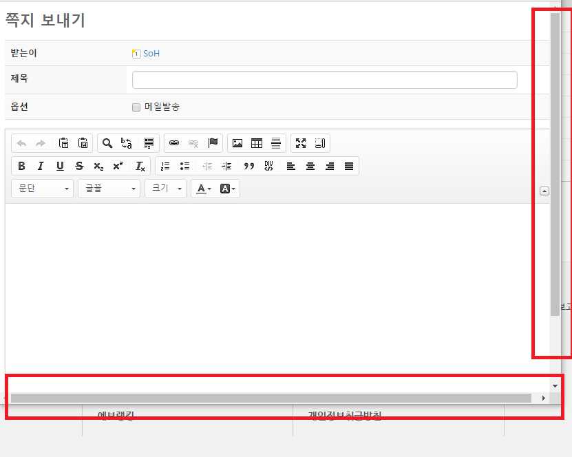 코어는 최신 버전을 사용하고 있습니다. 라이믹스와 차이인지 모르겠지만 회원에게 쪽지 보내기를 누르면 작성창이 팝업되는데요 제 사이트에서는 아래 이미지 처럼 레이아웃이 딱 맞질 않고 커서가 생깁니다. 글 작성 후 마우스를 아래로 드레그 해야지만 쪽지보내기 버튼이 보이거든요 별거 아니지만 뭔가 찜찜해서요