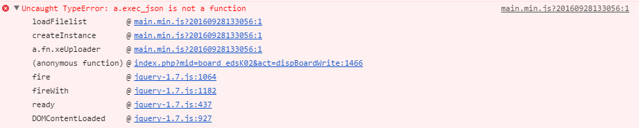 main.min.js?20160928133056:1 Uncaught TypeError: a.exec_json is not a functionloadFilelist @ main.min.js?20160928133056:1createInstance @ main.min.js?20160928133056:1a.fn.xeUploader @ main.min.js?20160928133056:1(anonymous function) @ index.php?mid=board_edsK02&act=dispBoardWrite:1466fire @ jquery-1.7.js:1064fireWith @ jquery-1.7.js:1182ready @ jquery-1.7.js:437DOMContentLoaded @ jquery-1.7.js:927