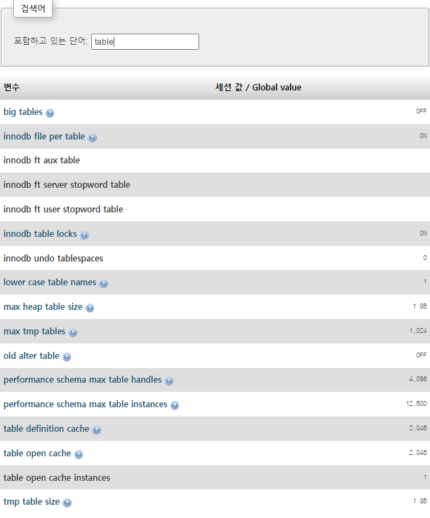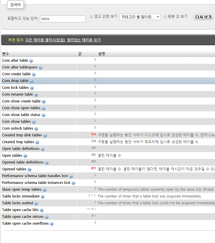 mysql 환경설정 조언 좀...부탁드립니다. 김병화 2016.11.25 10:22 174 0 0 Created tmp disk tables 이거랑 Open tables 이거 값이 마음에 들지 않는데 확 줄일 방법 있나요? 뭘 조정해줘야 할 지 모르겠습니다. sort_buffer_size join_buffer_size . . . 환경설정 값은 아래와 같습니다.