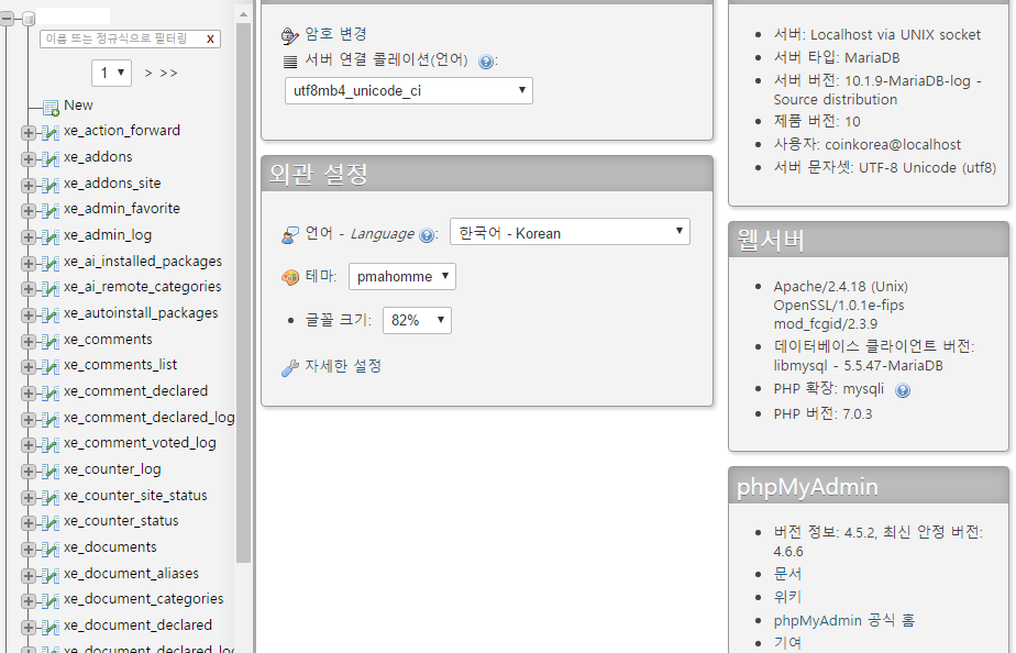 (스크린샷에 보이는 테이블들은 XE를 설치할 때 만들어진 것인가요?)