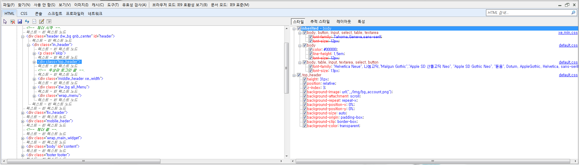 클릭으로 요소선택했을 때 저 부분이 default.css 파일의 top_header 부분이라고 나옵니다. (아래 그림 참조)
