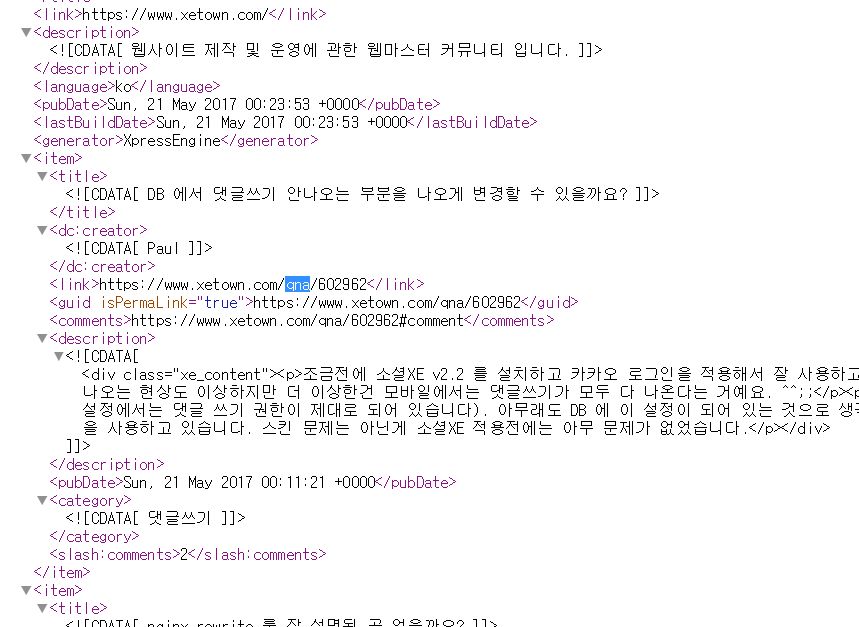 xe타운의 rss를 보면 https://xetown.com/rss 주소링크값에 드래그한 것 처럼 mid값이 보입니다.