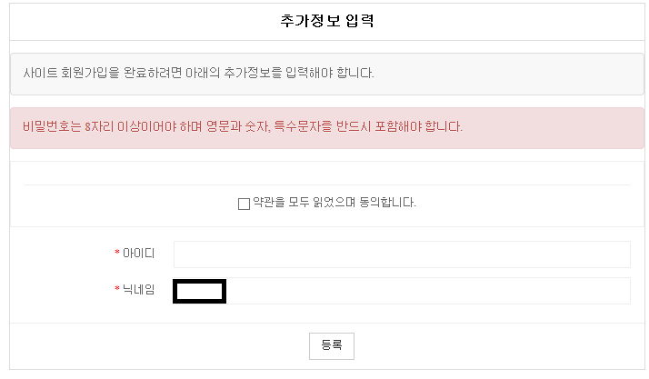 이페이지에 계속 있기를 누르고 다시 등록을 누르니 아래 화면으로 바뀝니다.