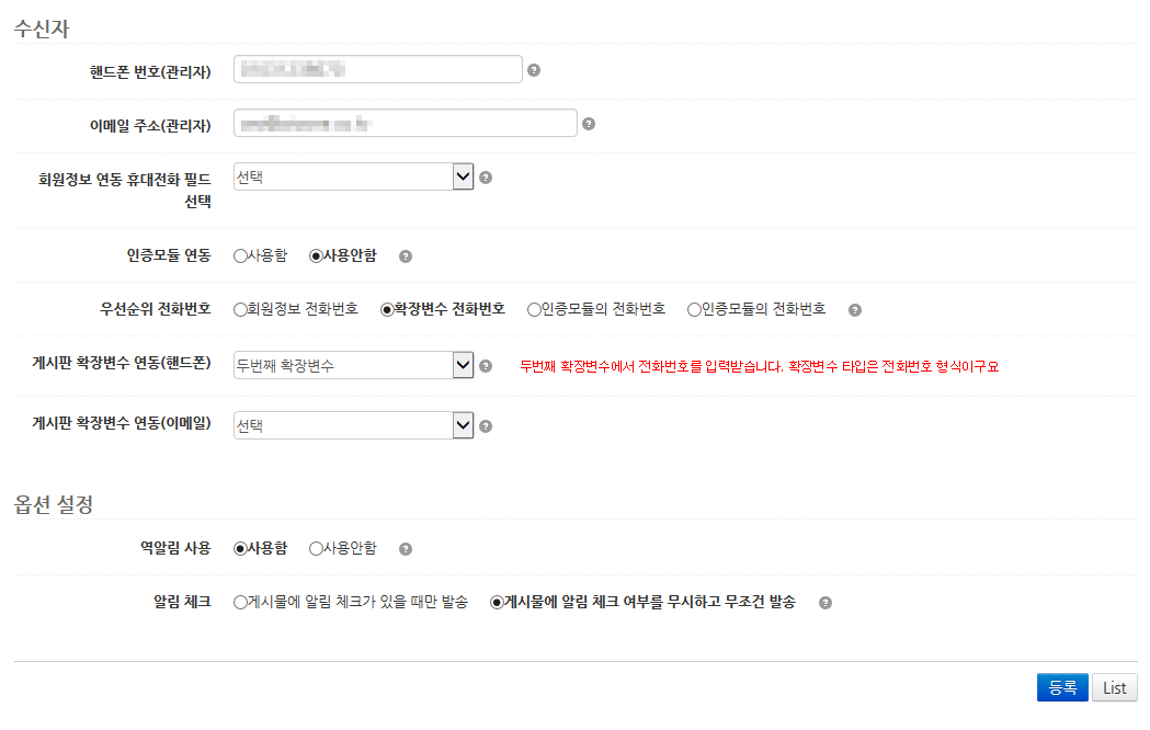 관리자 번호로는 댓글 알림 문자가 잘 오는데..확장변수로 등록한 휴대폰 번호로는 문자가 전송이 되지 않네요.
