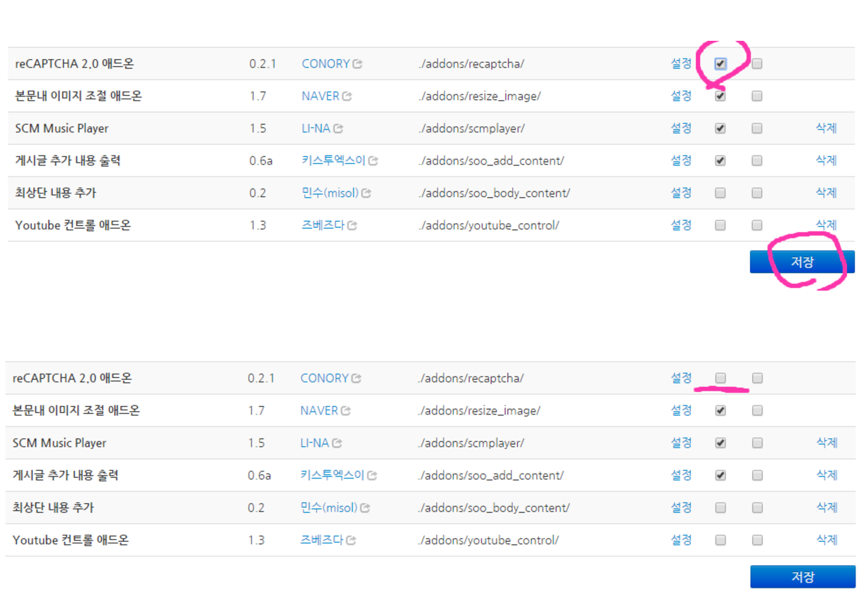 관리 - 설치된 에드온 들어가서 체크하고 저장을 누르면 그림과 같이 자동으로 체크가 해제 됩니다.