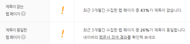 네이버 웹마스터 도구에서 분석해 보면 사이트의 페이지 제목이 없거나 동일하다고 나오네요.