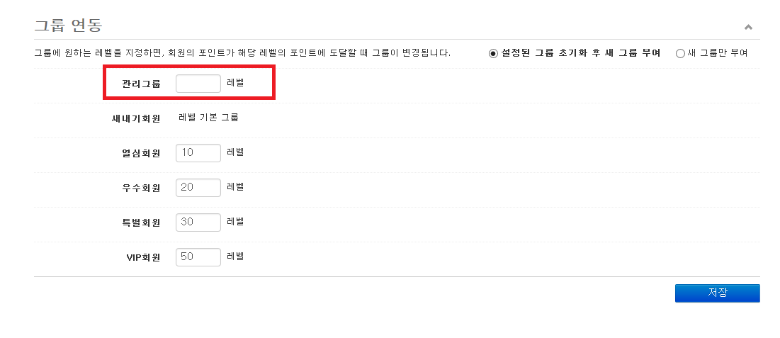 관리그룹은 레벨연동이 아닌 최고관리자가 지정한 회원들이 그룹을 가지게 되는 그룹으로 포인트와 연동과 무관합니다.