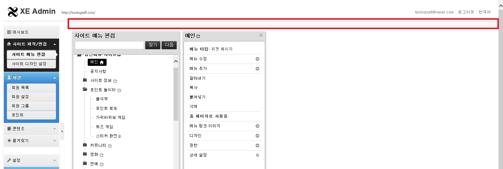 어드민 페이지에서 사이트 메뉴편집, 사이트 디자인 설정 부분에만 들어가면 상단에 저런 바가 생기네요;;
