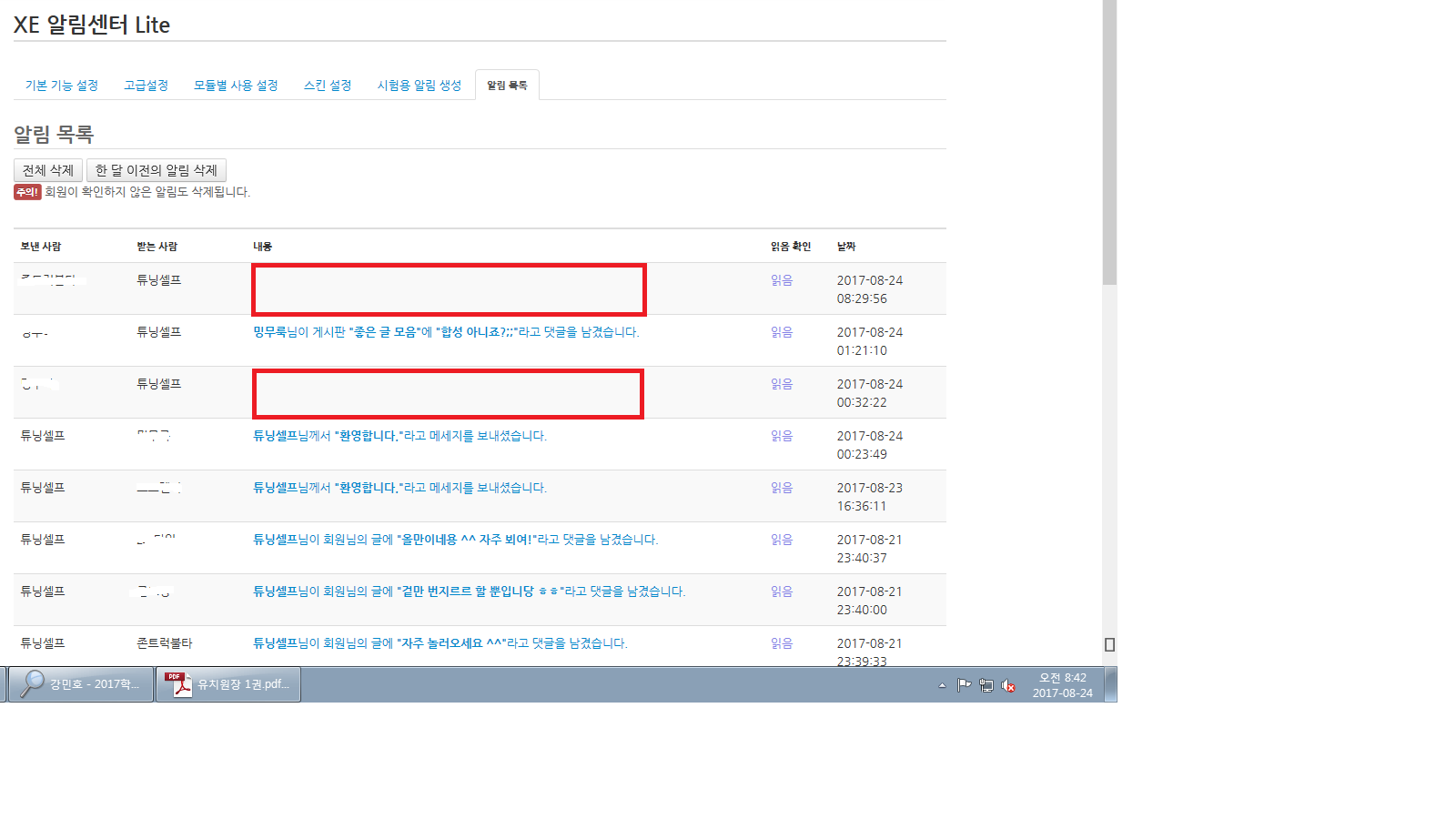 설정에서 '선택한 모듈의 알림을 관리자에게도 알림'을 선택했을 때 해당 게시판에 글이 남겨질 경우 관리자에게도 알림이 가는