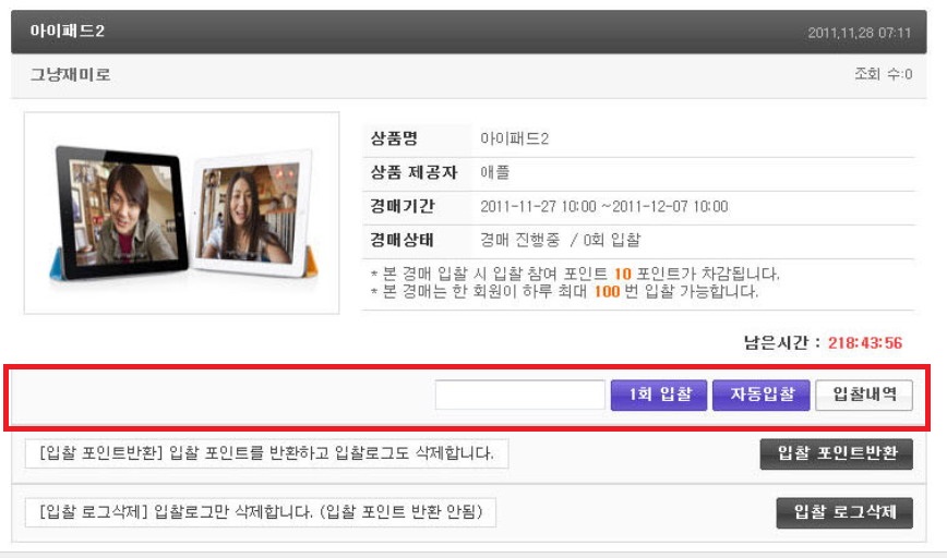 입찰내역 버튼이 왜 생성이 안되죠? humor 2017.09.14 08:31 303 0 0 위 사진 보시면 입찰내역, 1회 입찰, 자동입찰 버튼이 보이는데, 아래 사진엔 그게 없어요. 제가 만들었는데 왜 안나오는지 모르겠어요. 하라는대로 다 했는데 말이죠. 해결좀 해주세요.