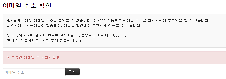이메일 인증을 요구하는 창이 나타나고 기존에 등록되지 않은 네이버 이메일 입력 후 확인을 눌러도 인증메일이 오지 않고 다시 이메일 입력을 요구하는 창이 나타납니다.