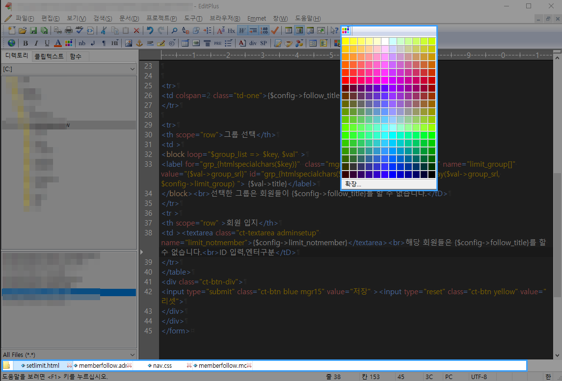 아래 editplus 처럼 컬러픽커 추가와 파일명 창 전환탭을 아래쪽으로 스크린샷 처럼 변경하고 싶어요.