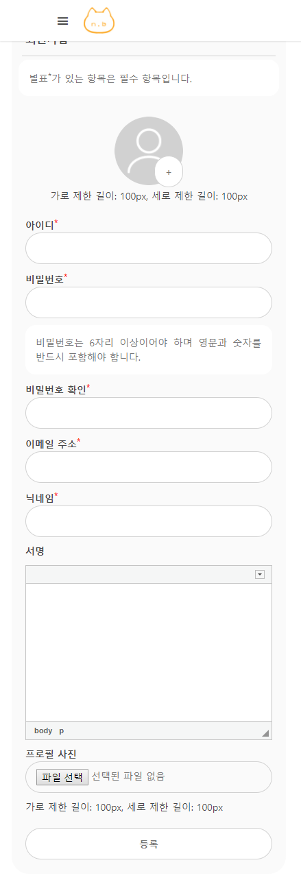 라이믹스 멤버스킨 rx_prn 회원가입폼 질문.. 아스타 2017.11.21 13:46 303 0 2 상단에서 프로필 사진을 넣을 수 있고 미리 보여주는 아주 이쁘고 근사한 스킨인데 하단에 프로필 사진 사진 선택칸이 또 뜨네요. 저걸 없애고 싶은데 signup_form.html 찾아봐도 어딜 건드려야할지 모르겠습니다.