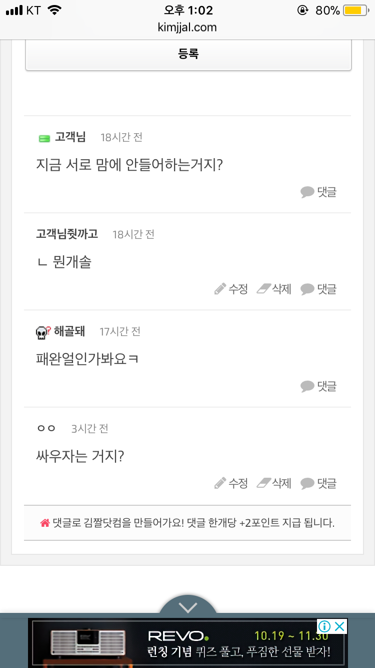 스케치북 댓글 나열문제 낙타 2017.11.22 04:03 187 0 3 계속해서 저런식으러 출력되지 않고 넘기는 방법이 있나요? 댓글이 너무 길어져서 밑으로 내려가는게 힘드네요ㅠㅠ