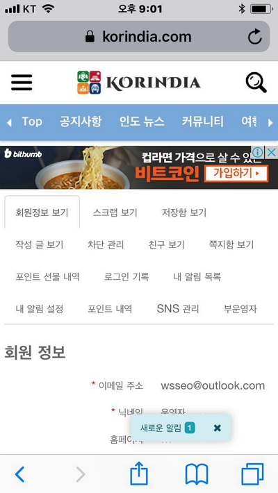이렇게 회원정보 상단 메뉴와 정보 내용 페이지가 뜨는데요.