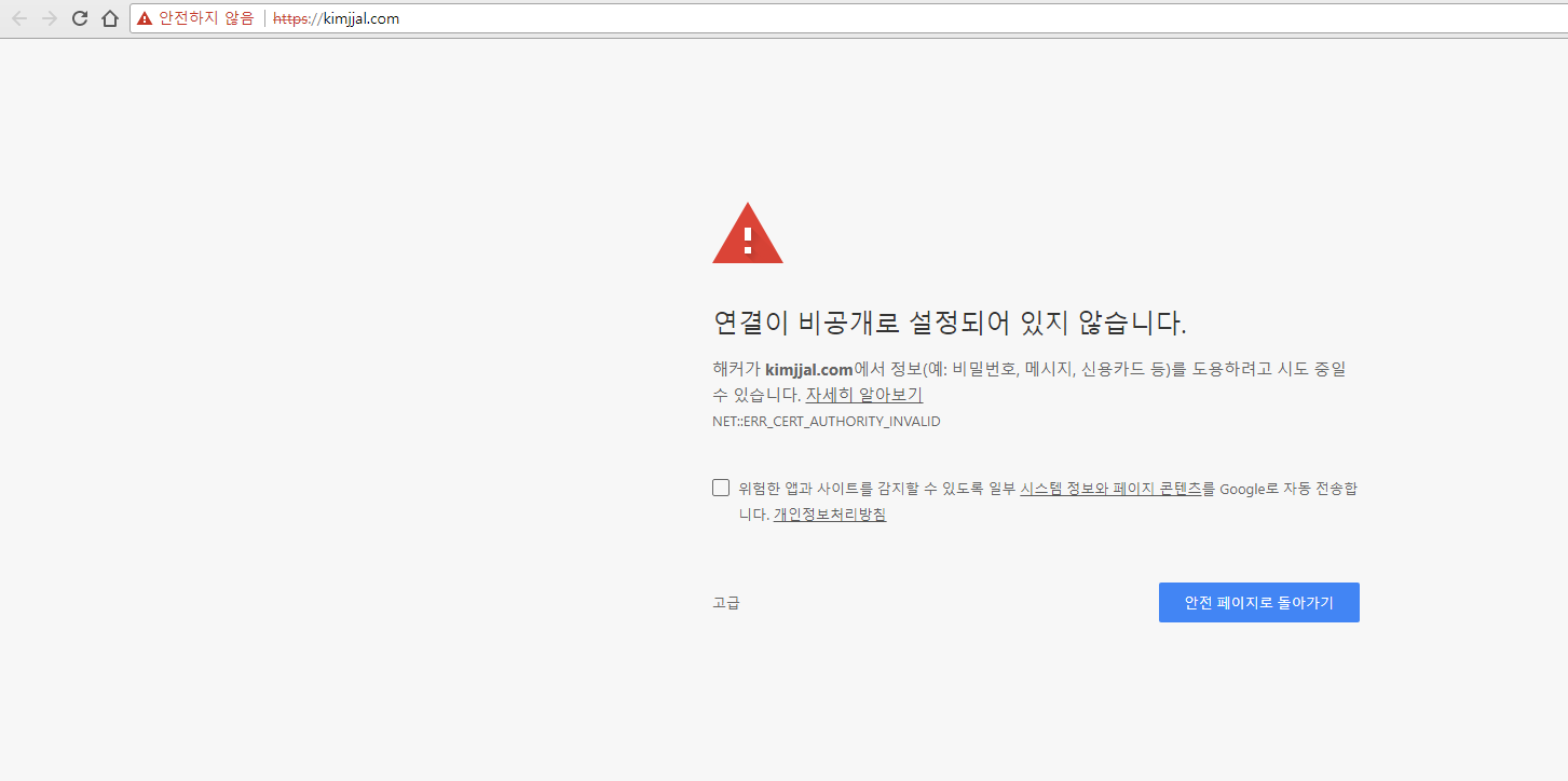 • 신뢰 할 수 없는 SSL 인증서라고 웹 브라우저에서 판단하기에 위와 같은 경고 창이 발생하는 것입니다.