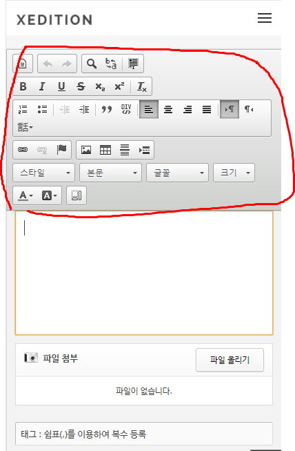 글 내용 입력하는 곳에 포커스 옮겨가면, 위지윅 에디터 컨트롤이 또 나와요.