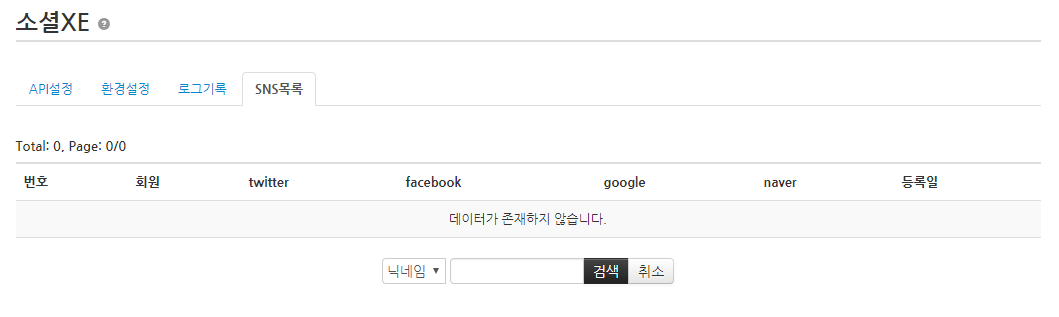 소셜XE는 정상적으로 작동하지만 SNS 목록이 보여지지 않습니다.