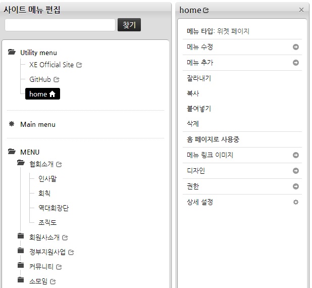메뉴설정할때, 홈페이지로 사용중. 클릭하면 그 페이지가