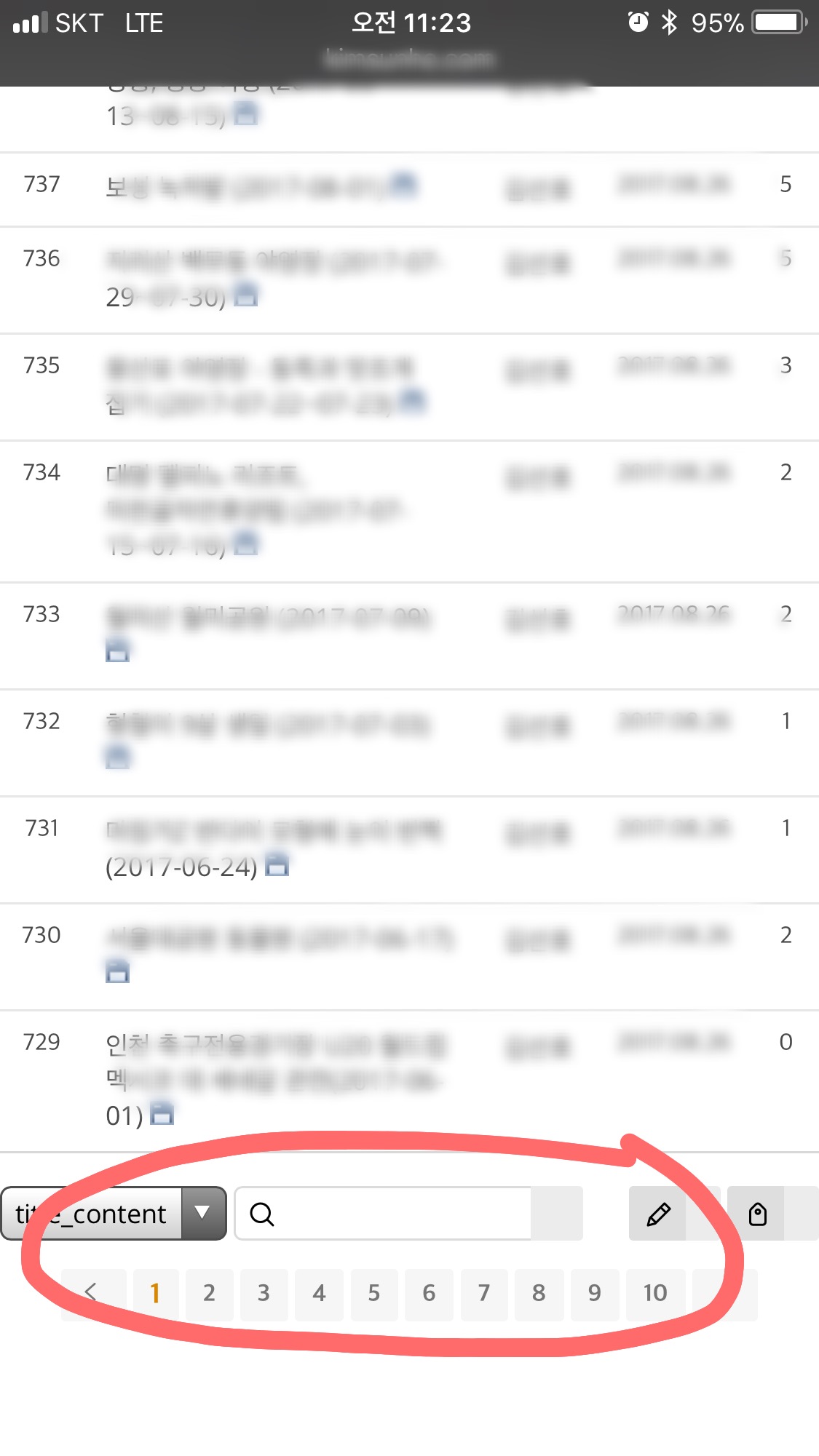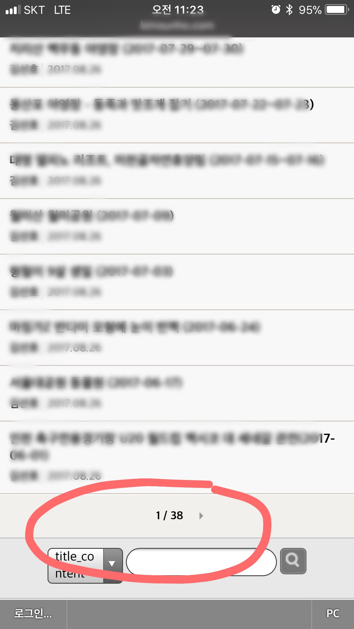 그런데 게시판 목록을 보면 맨 하단에 페이지 번호가 나와야되는데, PC로 볼 때나 핸드폰으로 PC버전보기 눌러서 볼 때는 하단에 첨부와 같이 페이지 번호가 나오고요,
