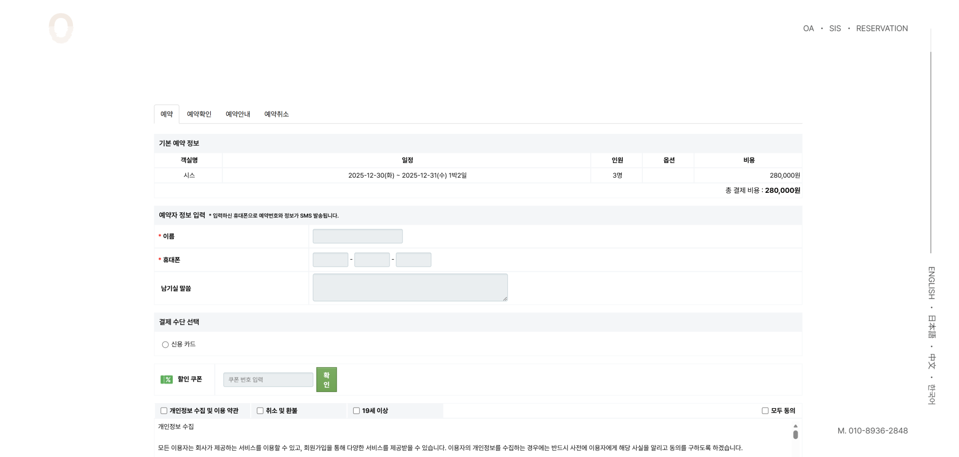 홈페이지 내에서 예약부터 결제까지 자연스럽게 이어지는 사용자 경험을 완성했습니다.